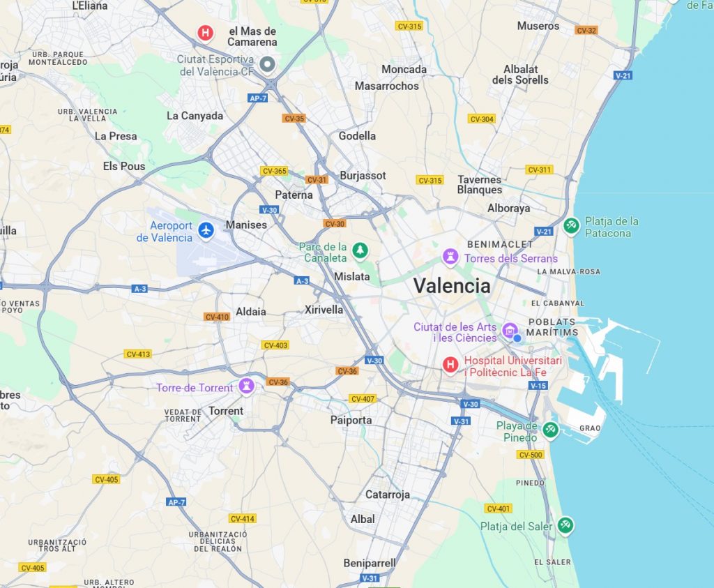 Valencia Airpot is just 5 kms away from the city of Valencia, in Manises. Go to Valencia Airport on Goggle Maps